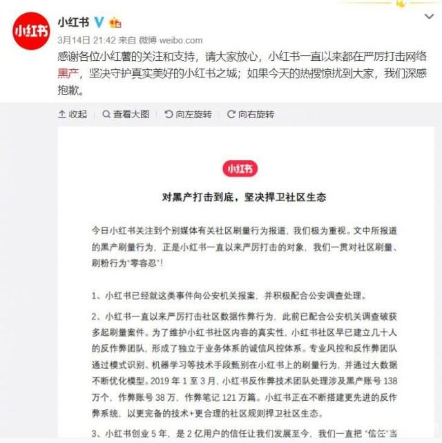 對(duì)此,小紅書(shū)官方微博發(fā)布聲明稱, 2019年1至3月,小紅書(shū)反作弊技術(shù)團(tuán)隊(duì)處理涉及黑產(chǎn)賬號(hào)138萬(wàn)個(gè),作弊賬號(hào)38萬(wàn),作弊筆記121萬(wàn)篇。小紅書(shū)正在不斷搭建更先進(jìn)的反作弊系統(tǒng),以更完備的技術(shù)+更合理的社區(qū)規(guī)則捍衛(wèi)社區(qū)生態(tài)。