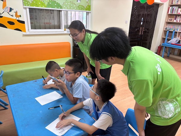 圖為實(shí)踐隊(duì)員引導(dǎo)學(xué)生小組開展對(duì)話活動(dòng)