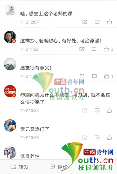 此事一經(jīng)自媒體傳播迅速,在網(wǎng)絡(luò)引發(fā)熱議。很多網(wǎng)友紛紛為此點贊打call。網(wǎng)友“@陳東東”評論:“超喜歡!”網(wǎng)友“@松”評論:“這樣抄,磨礪耐心,有好處,克制浮躁。”網(wǎng)友“@智障少女”更是直接表示:“哇,想去上這位老師的課!”