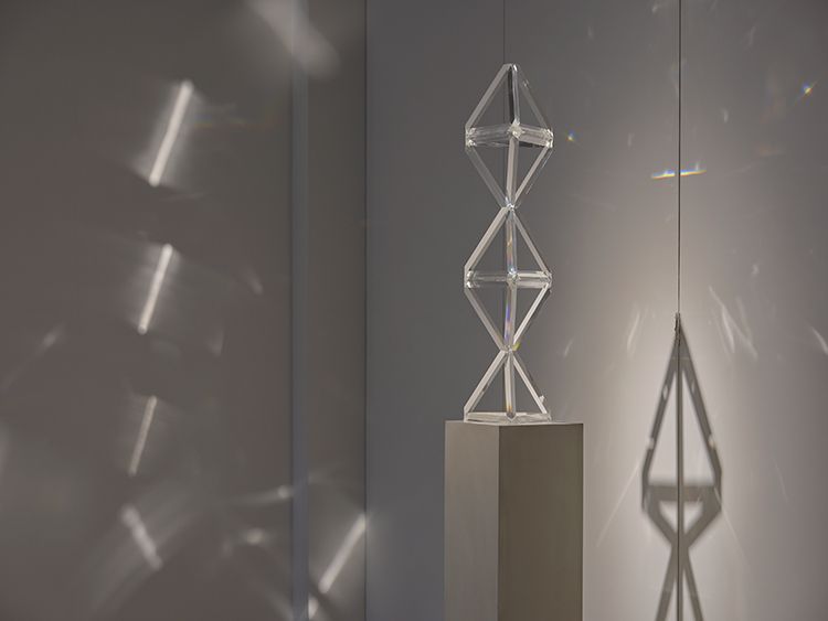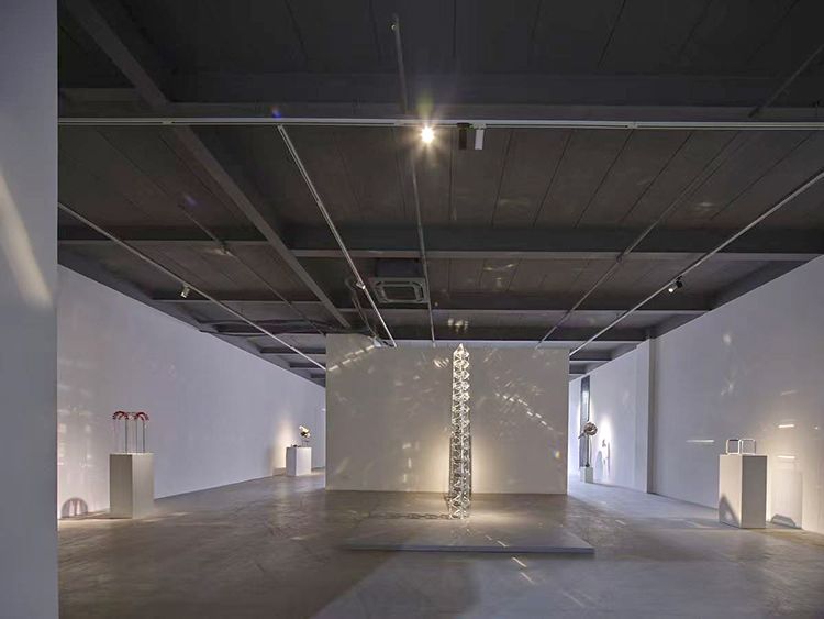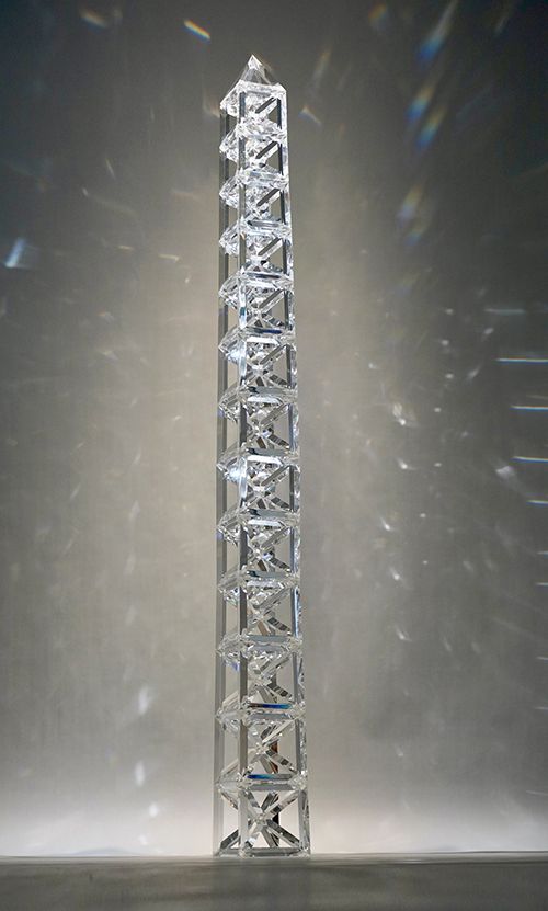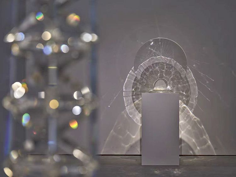 在《映》系列中,蔡志松展現(xiàn)了從宏大敘事向精微內(nèi)觀的形式蛻變,作品呈現(xiàn)出兩種相輔相成的面向:比如作品 《天際》,那座11層鏤空的錐形水晶塔,以其層層遞進、指向“天際”的尖銳結(jié)構(gòu),在“簡潔利落的幾何感”中,蘊含著一種理性的秩序與精神的向上感。它通體“通透”,卻又能在燈光下迸發(fā)出“填滿整個空間的絢爛光彩”。這完美詮釋了藝術(shù)家所追求的“堅實卻輕盈,允許一切穿過,又自有璀璨光華”的生命狀態(tài)。它既是物質(zhì)的塔,更是精神的塔,象徵著在歷經(jīng)層層修煉與提純後,內(nèi)心所能達到的既澄澈又光芒四射的境界。