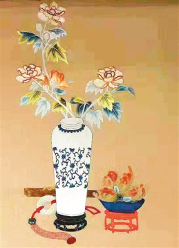 何曉霞復(fù)制的宮廷繡《輯珠打籽繡博古圖軸》