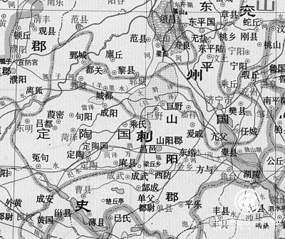 在戰(zhàn)國時,陶曾一度成為“天下之中”,因而,經(jīng)由函谷關(guān)而東西方向橫亙的交通大干道,必然要從洛陽向東延伸途經(jīng)大梁而抵達于陶。過了陶,再向東稍行,就是后來昌邑國的首縣昌邑縣。而若是由此昌邑進一步向東,受魯中山地高低起伏變化的影響,道路已經(jīng)無法像平地一樣通暢了。這條東西向大干道,在經(jīng)過西漢昌邑縣治所之后,與一條略近于南北向的大干道相連接。這條干道,南端來自彭城方向,大致循泗水、菏水水道西北行,在西漢昌邑縣東側(cè)不遠的地方,轉(zhuǎn)而北上,經(jīng)巨野澤東側(cè),再向北,則抵達黃河下游的重要津渡——平原津。