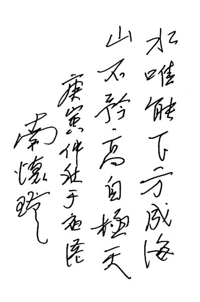 這次辭行時(shí),老師要我在他的辦公桌旁坐下來(lái),抽出一張空白A4紙,想了想,給我寫(xiě)了兩句話:“水唯能下方成海,山不矜高自極天。”接著破天荒地寫(xiě)下落款“庚寅仲秋于廟港”,并簽了大名。這來(lái)自《孔氏家語(yǔ)》,也是演變自《道德經(jīng)》的精華,是可以管我一生做人做事的道理,卻未想到是老師的最后一次誨勉?,F(xiàn)在回想,不由得一驚——正是2年后的彼日彼時(shí),他駕鶴西去,永遠(yuǎn)離開(kāi)了我們!
