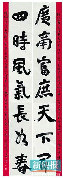 ■李鵬程書(shū)寫(xiě)條幅,是明人詩(shī)句“廣南富庶天下聞,四時(shí)風(fēng)氣長(zhǎng)如春”。500cm×130cm。
