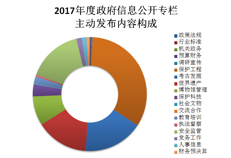 報(bào)告顯示,在2017年主動(dòng)發(fā)布的1972件政務(wù)信息中,依照事務(wù)類別分為:政策法規(guī)6條,行業(yè)標(biāo)準(zhǔn)4條,機(jī)關(guān)政務(wù)2條,預(yù)算財(cái)務(wù)2條,調(diào)研宣傳2條,保護(hù)工程659條,考古發(fā)掘334條,世界遺產(chǎn)293條,博物館管理164條,保護(hù)科技67條,社會(huì)文物4條,交流合作1條,教育培訓(xùn)39條,執(zhí)法督察11條,安全監(jiān)管309條,黨務(wù)工作31條,人事信息26條;財(cái)務(wù)預(yù)決算更新18條。新增行業(yè)標(biāo)準(zhǔn)欄目,并更新79條,機(jī)構(gòu)設(shè)置及其他重要欄目共更新162條。根據(jù)要求新增派駐機(jī)構(gòu)相關(guān)欄目,轉(zhuǎn)載文化部派駐監(jiān)督相關(guān)信息,共27條。2017年,通過(guò)政府網(wǎng)站信息公開專欄查閱政府信息約2904萬(wàn)人次,比2016年度增加7.5%。