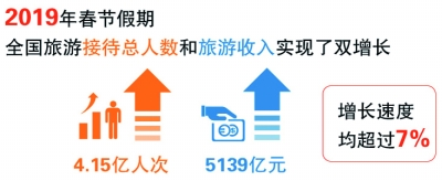 2019年春節(jié)假期,全國旅游接待總?cè)藬?shù)和旅游收入實現(xiàn)雙增長,增長速度均超過7%,分別達到4.15億人次、5139億元;短視頻、網(wǎng)絡直播助力“吃住行游購娛”等傳統(tǒng)業(yè)態(tài)發(fā)展;互聯(lián)網(wǎng)上網(wǎng)服務行業(yè)深入開展轉(zhuǎn)型升級,呈現(xiàn)出良好發(fā)展態(tài)勢;“文明旅游 為中國加分”活動深入人心,中國出境游游客越來越受歡迎;中國電子競技行業(yè)在國際上嶄露頭角,收獲多項國際大獎……