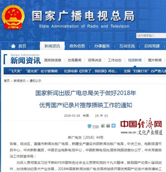 原標(biāo)題:廣電總局:做好2018年優(yōu)秀國產(chǎn)紀(jì)錄片推薦播映工作