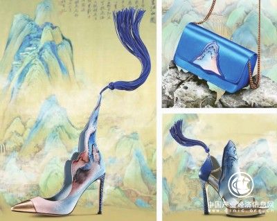 《千里江山》系列緙絲高訂箱包、女鞋。PACC攜手第六代緙絲傳承人王建江與中國(guó)原創(chuàng)文化設(shè)計(jì)鞋履品牌sheme設(shè)計(jì)師李丹、海派設(shè)計(jì)師苗海燕共同創(chuàng)作。