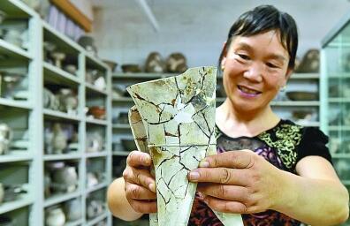 二里頭遺址女考古技工王叢苗在洛陽偃師二里頭考古隊展示一件修復后的文物。新華社發(fā)