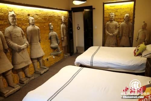 資料圖:民宿臥室內(nèi)的“兵馬俑”裝飾。近日,西安一家主打“兵馬俑”元素的民宿走紅,讓不少旅客感嘆如同居住在“秦始皇陵”。中新社記者張遠(yuǎn)攝