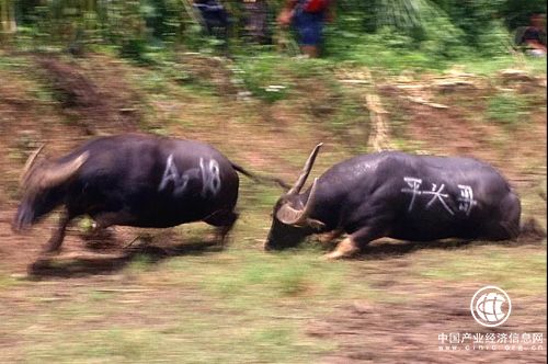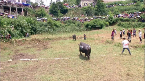 比賽還未開始,聞?dòng)嵍鴣淼挠慰鸵约爸苓叴逭娜罕娫缭绲鼐桶讯放?chǎng)圍得水泄不通。斗牛場(chǎng)上,強(qiáng)壯的水牛威風(fēng)凜凜,蓄勢(shì)待發(fā),隨著主持人宣布開始,剎時(shí),人群歡聲雷動(dòng),嗩吶喧囂,鼓樂齊鳴,主人剛松下手中的套繩,兩頭水牛便急速地邁開步伐四角相撞,雙方實(shí)力相當(dāng)僵持不下。激戰(zhàn)中,難解難分者有之、打翻在地者有之、倉皇敗逃者有之。比賽現(xiàn)場(chǎng),驚險(xiǎn)刺激的場(chǎng)面不時(shí)贏得觀眾陣陣喝彩,使得比賽現(xiàn)場(chǎng)高潮迭起、熱鬧非凡。