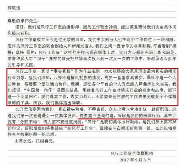 昨日下午,一個(gè)名叫“新風(fēng)行工作室”的微博號(hào)發(fā)表了一則聲明,稱他們是風(fēng)行工作室的攝影師,因工作理念沖突,經(jīng)過慎重商討決定集體向卓偉辭職。信中寫道:八卦不是捕風(fēng)捉影的猜測(cè),需要求真求實(shí),爆料不是一個(gè)人的舞臺(tái),需要整個(gè)團(tuán)隊(duì)通力協(xié)作。不希望辛苦完成的工作成果變成某個(gè)個(gè)體博眼球的工具。——“中國(guó)第一狗仔”是團(tuán)隊(duì)結(jié)晶,而不是一個(gè)明星網(wǎng)紅。信中還強(qiáng)調(diào):辭職是我們的群體行為,其中并沒有“分贓不均”,請(qǐng)大家不要過度揣測(cè)。