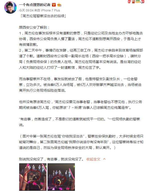 據(jù)臺(tái)灣媒體《蘋果日?qǐng)?bào)》5月3日?qǐng)?bào)道,周杰倫(周董)上月30日在西安開唱時(shí),以為現(xiàn)場(chǎng)民警將粉絲燈牌丟掉,一時(shí)護(hù)粉心切,怒嗆民警“滾出去”,稍晚他理清原委,除了在杰威爾官方微博向民警道歉,之后更親自到安保指揮部遞交道歉信,并拍道歉影片,昨日央視報(bào)道還夸他知錯(cuò)能改,是優(yōu)質(zhì)偶像。