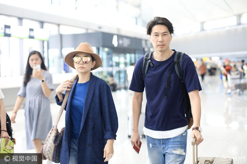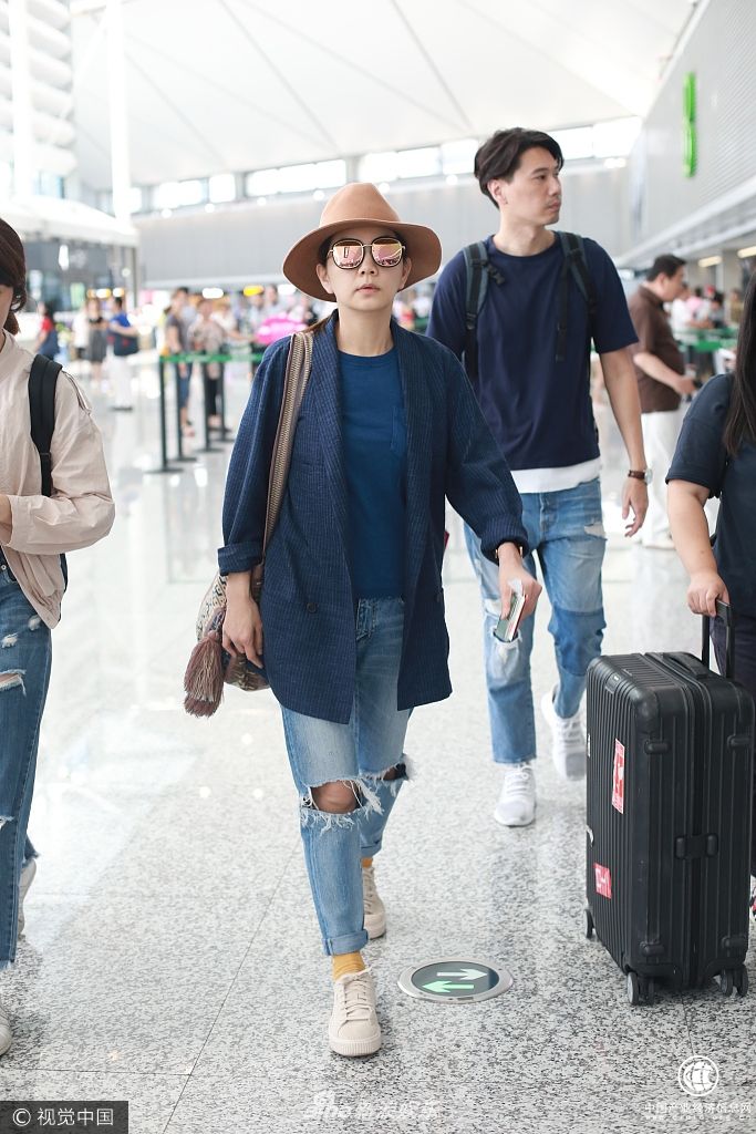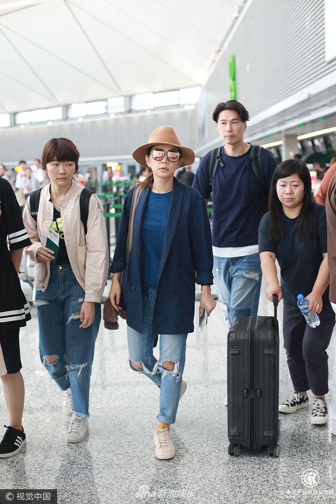 31日,Ella陳嘉樺與老公現(xiàn)身上海機(jī)場,Ella身穿藍(lán)色西裝破洞褲休閑范十足,老公一邊緊跟保持距離為老婆保駕護(hù)航。(視覺中國/圖)