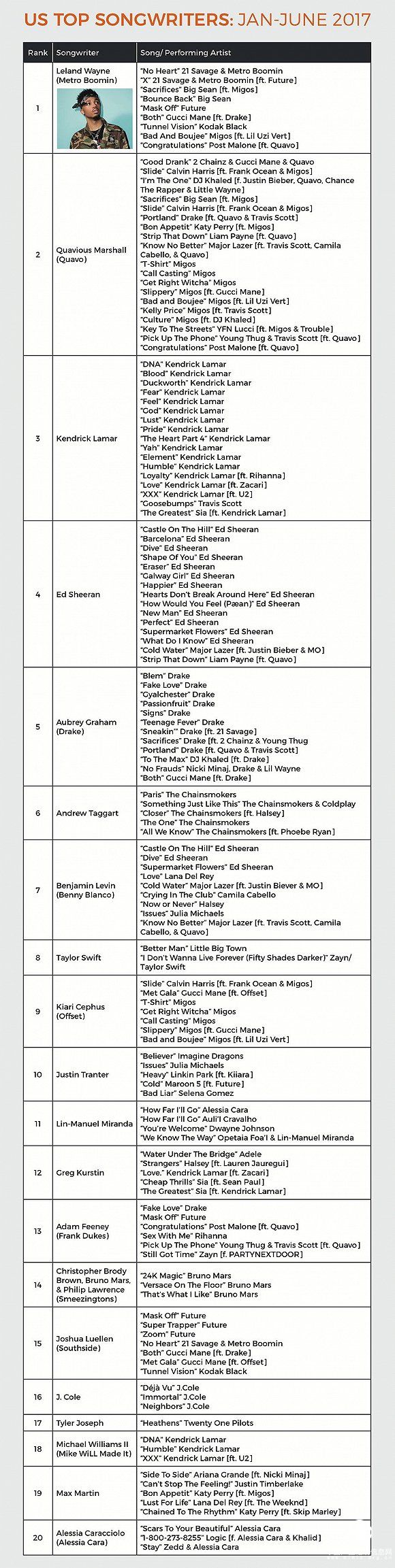 排名第二的QuaviousMarshall則是以量取勝,他一共有19首參與創(chuàng)作的歌曲進(jìn)入了上半年的BillboardHot100排行榜!關(guān)鍵是,他同樣是一名HipHop創(chuàng)作者。實(shí)際上,在排行前五位的詞曲作者中,除了黃老板EdSheeran,其余四位都是HipHop藝人或制作人。
