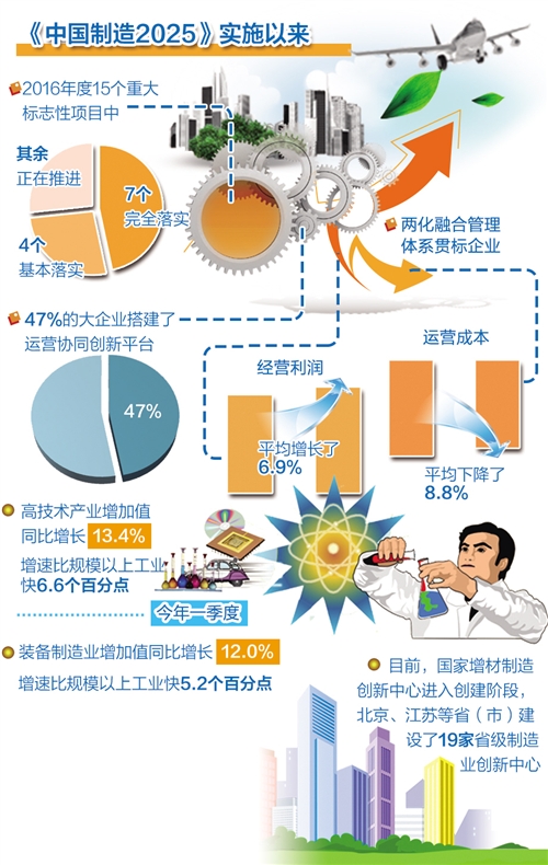 自《中國(guó)制造2025》實(shí)施以來(lái),國(guó)家制造業(yè)創(chuàng)新中心建設(shè)、智能制造、工業(yè)強(qiáng)基、綠色制造、高端裝備創(chuàng)新等“五大工程”扎實(shí)推進(jìn)。在2016年度15個(gè)重大標(biāo)志性項(xiàng)目中,已有7個(gè)完全落實(shí),4個(gè)基本落實(shí)。整體看,我國(guó)制造業(yè)有自己的獨(dú)特機(jī)遇和優(yōu)勢(shì),“中國(guó)制造2025”可期可待——