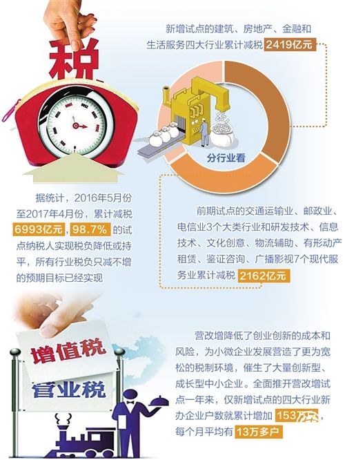 據(jù)統(tǒng)計,2016年5月份至2017年4月份,也就是全面推開營改增試點一年來,累計減稅6993億元,98.7%的試點納稅人實現(xiàn)稅負(fù)降低或持平,所有行業(yè)稅負(fù)只減不增的預(yù)期目標(biāo)已經(jīng)實現(xiàn)。分行業(yè)看,新增試點的建筑、房地產(chǎn)、金融和生活服務(wù)四大行業(yè)累計減稅2419億元,前期試點的“3+7”行業(yè)(交通運輸業(yè)、郵政業(yè)、電信業(yè)3個大類行業(yè)和研發(fā)技術(shù)、信息技術(shù)、文化創(chuàng)意、物流輔助、有形動產(chǎn)租賃、鑒證咨詢、廣播影視7個現(xiàn)代服務(wù)業(yè))累計減稅2162億元,原增值稅行業(yè),主要是制造業(yè)累計減稅2412億元。