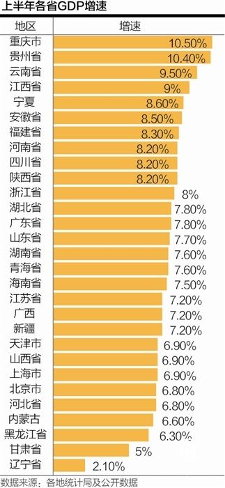 按此計(jì)算,重慶、貴州、云南上半年經(jīng)濟(jì)增速分別為10.5%、10.4%、9.5%,居其后。