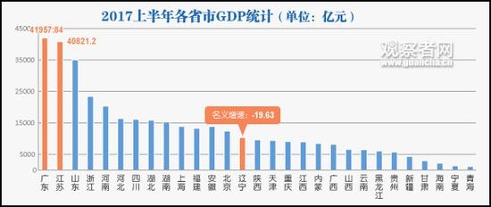 經(jīng)過觀察者網(wǎng)統(tǒng)計(jì)發(fā)現(xiàn),2017上半年排名前兩位的廣東和江蘇GDP已超過4萬億,遠(yuǎn)遠(yuǎn)拉開了和第三位山東省3.5萬億元的差距。值得注意的是遼寧省,上半年的名義增速是負(fù)19.63。根據(jù)目前數(shù)據(jù),全國(guó)進(jìn)入“萬億俱樂部”的省份至少有14個(gè)。