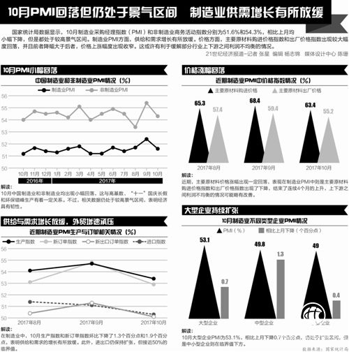 統(tǒng)計局?jǐn)?shù)據(jù)顯示,2017年10月制造業(yè)PMI為51.6%,比上個月下降0.8個百分點,但高于去年同期0.4個百分點。