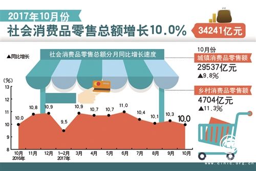 ——從生產(chǎn)看,規(guī)模以上工業(yè)增加值同比增速加快0.1個(gè)百分點(diǎn);服務(wù)業(yè)生產(chǎn)指數(shù)同比增速加快0.2個(gè)百分點(diǎn)。從需求看,社會(huì)消費(fèi)品零售總額同比增速持平;前10個(gè)月固定資產(chǎn)投資增速雖比1至9月份略有回落,但投資在優(yōu)化供給結(jié)構(gòu)方面的作用持續(xù)發(fā)揮;10月份出口同比增長(zhǎng)6.1%,而上年同月出口下降了3.8%。