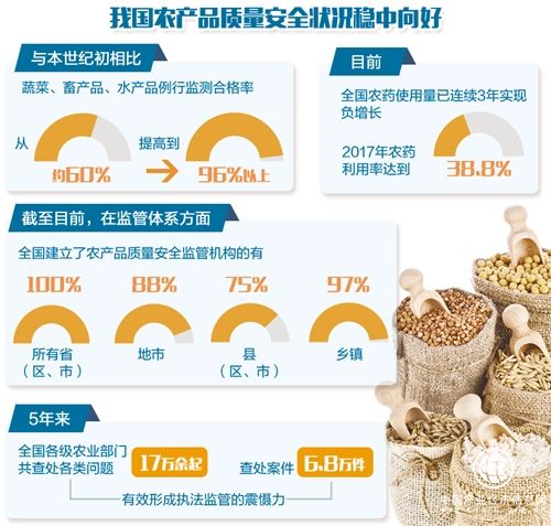 數(shù)據(jù)顯示,我國(guó)主要農(nóng)產(chǎn)品監(jiān)測(cè)合格率連續(xù)5年穩(wěn)定在96%以上,2017年達(dá)到97.8%,比2016年提高0.3個(gè)百分點(diǎn),農(nóng)產(chǎn)品質(zhì)量安全形勢(shì)保持穩(wěn)中向好的態(tài)勢(shì)。各地大力發(fā)展無公害、綠色、有機(jī)和地理標(biāo)志農(nóng)產(chǎn)品,“三品一標(biāo)”農(nóng)產(chǎn)品總數(shù)達(dá)12.1萬(wàn)個(gè),跟蹤抽檢合格率達(dá)到98%以上。一大批優(yōu)質(zhì)安全的農(nóng)產(chǎn)品擺上了超市貨架和百姓餐桌,更好地適應(yīng)了居民多元化的消費(fèi)需求。