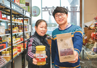大學(xué)畢業(yè)后回到家鄉(xiāng)創(chuàng)辦電商公司的張偉和母親在新疆精河縣線下實(shí)體店展示自家出售的特產(chǎn)。新華社記者 胡虎虎 攝