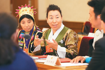 全國人大代表,西藏拉薩城關(guān)區(qū)納金鄉(xiāng)主任科員、塔瑪村黨委第一書記格桑卓嘎在發(fā)言。姚海全 攝