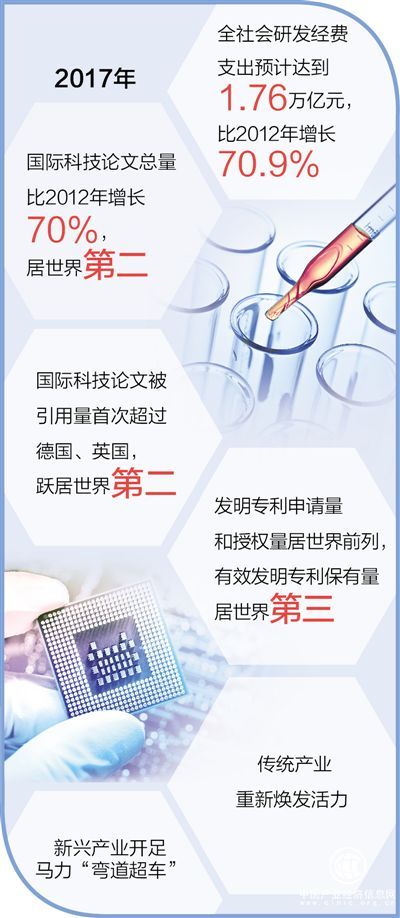 數(shù)據(jù)顯示,2017年,全社會(huì)研發(fā)經(jīng)費(fèi)支出預(yù)計(jì)達(dá)到1.76萬(wàn)億元,比2012年增長(zhǎng)70.9%。國(guó)際科技論文總量比2012年增長(zhǎng)70%,居世界第二;國(guó)際科技論文被引用量首次超過(guò)德國(guó)、英國(guó),躍居世界第二。發(fā)明專利申請(qǐng)量和授權(quán)量居世界前列,有效發(fā)明專利保有量居世界第三。我國(guó)已成為具有全球影響力的科技大國(guó)、創(chuàng)新大國(guó)。創(chuàng)新驅(qū)動(dòng)發(fā)展成果豐碩。