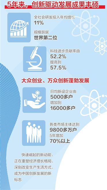 這5年,載人航天、深海探測、量子通信、大飛機(jī)等重大創(chuàng)新成果不斷涌現(xiàn);高鐵網(wǎng)絡(luò)、電子商務(wù)、移動支付、共享經(jīng)濟(jì)等引領(lǐng)世界潮流……這一切,都源于我們實(shí)施的創(chuàng)新驅(qū)動發(fā)展戰(zhàn)略