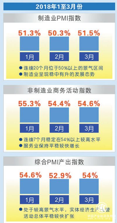 PMI延續(xù)去年良好態(tài)勢。今年1—3月份PMI分別為51.3%、50.3%和51.5%,連續(xù)20個月位于50%以上的景氣區(qū)間,制造業(yè)呈現(xiàn)穩(wěn)中有升的較好發(fā)展態(tài)勢。