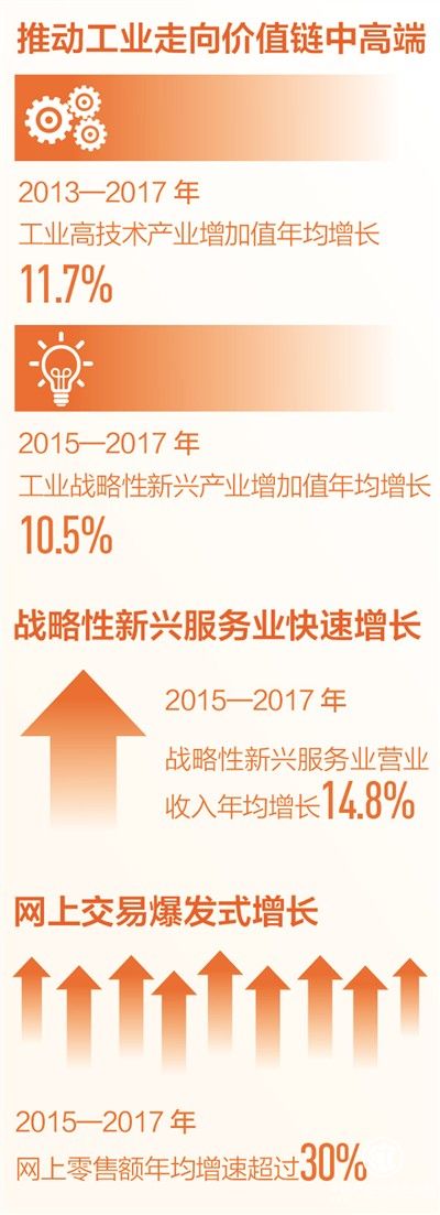 戰(zhàn)略性新興服務(wù)業(yè)快速增長,服務(wù)質(zhì)量和水平不斷提升。2015—2017年,戰(zhàn)略性新興服務(wù)業(yè)營業(yè)收入年均增長14.8%,高于同期規(guī)模以上服務(wù)業(yè)營業(yè)收入年均增速3.5個(gè)百分點(diǎn)。網(wǎng)上交易爆發(fā)式增長,激發(fā)了國內(nèi)市場活力和消費(fèi)需求。2015—2017年,網(wǎng)上零售額年均增速超過30%,高于社會消費(fèi)品零售總額年均增速約20個(gè)百分點(diǎn)。