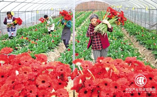 四川眉山市彭山區(qū)鳳鳴鎮(zhèn)村民在明都花卉基地幫業(yè)主采摘非洲菊。近年來,四川眉山市彭山區(qū)通過規(guī)范土地流轉(zhuǎn),調(diào)動有能力的業(yè)主流轉(zhuǎn)土地發(fā)展花卉等產(chǎn)業(yè),當(dāng)?shù)刎毨Т迕裨讷@得流轉(zhuǎn)土地收益后還能在基地務(wù)工。 姚永亮 攝