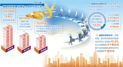 2017年,在城鎮(zhèn)非私營單位中,信息傳輸、軟件和信息技術服務業(yè)平均工資水平繼續(xù)位列行業(yè)門類首位,其中互聯(lián)網(wǎng)和相關服務業(yè)平均工資增長13.0%,比上年提高4.9個百分點,高于全國平均工資增幅3個百分點。在城鎮(zhèn)私營單位中,信息傳輸、軟件和信息技術服務業(yè)的平均工資增長10.8%,比上年提高0.6個百分點,高于全部城鎮(zhèn)私營單位平均工資增幅4個百分點。