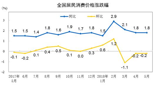 2018年5月份,全國居民消費價格同比上漲1.8%。其中,城市上漲1.8%,農(nóng)村上漲1.7%;食品價格上漲0.1%,非食品價格上漲2.2%;消費品價格上漲1.3%,服務價格上漲2.5%。1-5月平均,全國居民消費價格比去年同期上漲2.0%。