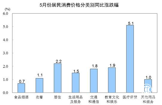 其他七大類價格同比均上漲。其中,醫(yī)療保健、居住、教育文化和娛樂價格分別上漲5.1%、2.2%和1.9%,交通和通信、生活用品及服務價格分別上漲1.8%和1.5%,衣著、其他用品和服務價格分別上漲1.1%和1.0%。
