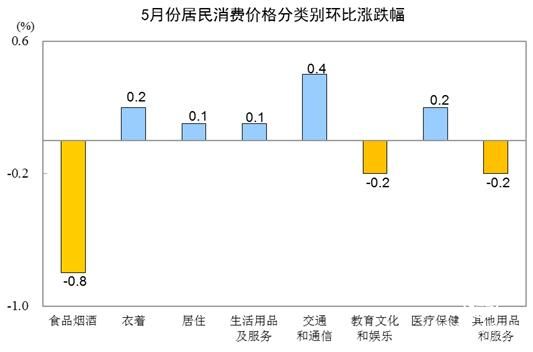5月份,全國居民消費價格環(huán)比下降0.2%。其中,城市下降0.2%,農(nóng)村下降0.1%;食品價格下降1.3%,非食品價格上漲0.1%;消費品價格下降0.2%,服務價格下降0.1%。