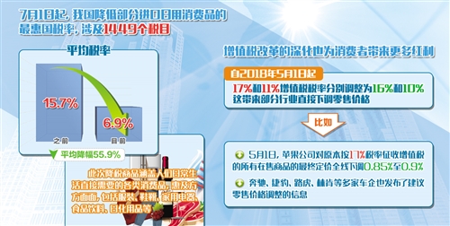 增值稅改革的深化也為消費(fèi)者帶來(lái)更多紅利。自2018年5月1日起,17%和11%增值稅稅率分別調(diào)整為16%和10%。這部分行業(yè)直接下調(diào)了零售價(jià)格。比如,5月1日,蘋(píng)果公司對(duì)原本按17%稅率征收增值稅的所有在售商品最終定價(jià)全線(xiàn)下調(diào)0.85%至0.9%。奔馳、捷豹、路虎、林肯等多家車(chē)企也發(fā)布了建議零售價(jià)格調(diào)整的信息。
