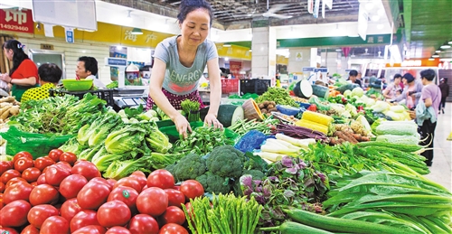 9月10日,在南京一家農(nóng)貿(mào)市場,一名商販在整理蔬菜。蘇陽攝(新華社發(fā))