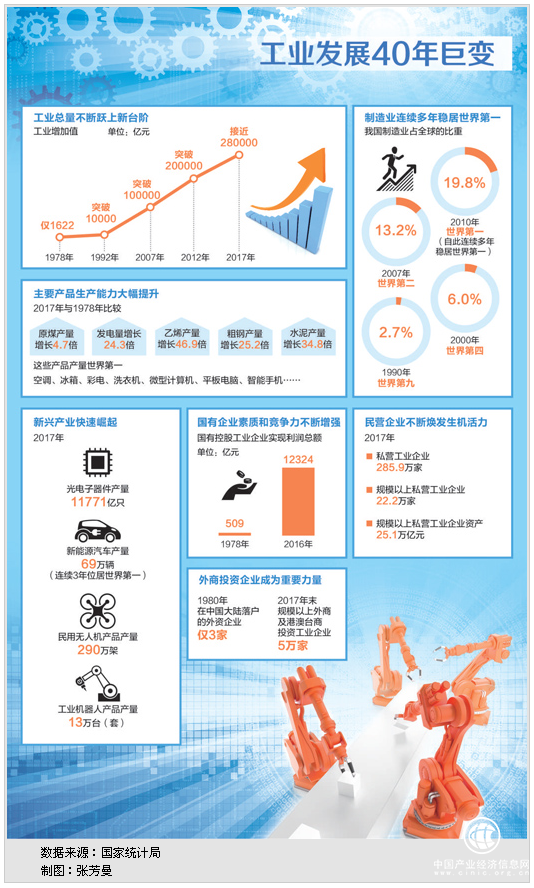 1978年1622億元,1992年突破1萬億元,2007年突破10萬億元,2012年突破20萬億元,2017年接近28萬億元……這條持續(xù)躍升的曲線,就是改革開放40年來中國工業(yè)增加值的增長軌跡。
