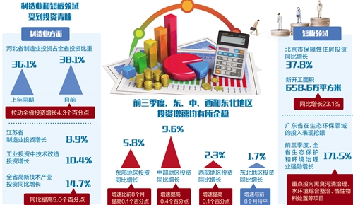 在政策的帶動下,前三季度,東、中、西和東北地區(qū)投資增速均有所企穩(wěn)。其中,東部地區(qū)投資同比增長5.8%,增速比前8個月提高0.1個百分點;中部地區(qū)投資增長9.6%,增速提高0.4個百分點;西部地區(qū)投資增長2.3%,增速提高0.1個百分點;東北地區(qū)投資增長1.7%,增速與前8個月持平。