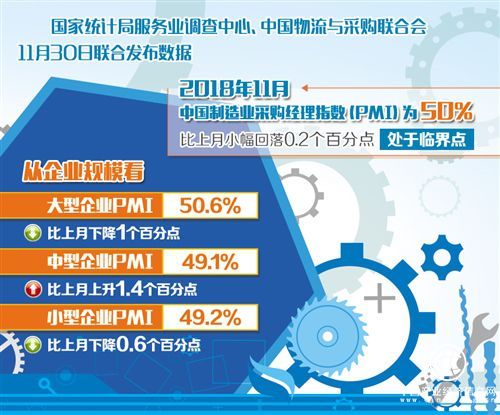 11月30日,國家統(tǒng)計局服務(wù)業(yè)調(diào)查中心和中國物流與采購聯(lián)合會發(fā)布了中國采購經(jīng)理指數(shù)。11月份,制造業(yè)采購經(jīng)理指數(shù)(PMI)為50.0%,比上月小幅回落0.2個百分點,處于臨界點;非制造業(yè)商務(wù)活動指數(shù)為53.4%,比上月回落0.5個百分點。