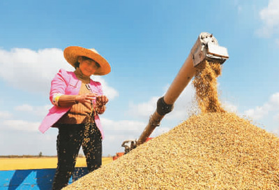 圖為山東省臨沂市郯城縣郯城街道歸義四村種糧大戶孫宗俠在收獲水稻。張春雷攝(新華社發(fā))