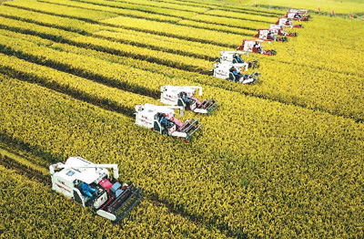 2018年9月20日,農(nóng)民駕駛收割機(jī)在江蘇省淮安市盱眙縣黃花塘鎮(zhèn)老營“蝦稻共生”示范基地收獲水稻。周海軍攝(新華社發(fā))