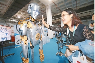 5月6日至8日,2019北京國際軍民兩用裝備展覽會(huì)在北京舉行。展覽匯聚了國內(nèi)外近150家企業(yè)參展,展品涉及多個(gè)領(lǐng)域的軍用、民用創(chuàng)新產(chǎn)品和技術(shù)。圖為參觀者在展覽會(huì)上與教育機(jī)器人互動(dòng)。陳曉根攝(人民視覺)