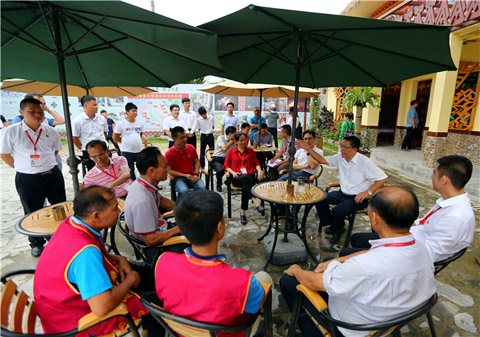 調(diào)研組一行現(xiàn)場(chǎng)與鎮(zhèn)、村干部進(jìn)行座談