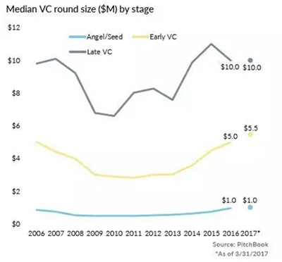 一季度594個早期投資交易總共募集57億美元的金額,投資交易數(shù)量同比下降21%,總金額同比基本持平。投資金額中位數(shù)和平均值都比2016年全年增長9%,而且估值繼續(xù)保持高位。