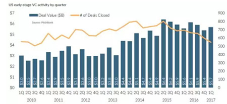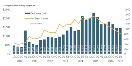 投資交易數(shù)量最明顯的下降就發(fā)生在天使和種子階段。2017年第一季度827筆交易共募集15億美元的金額,分別同比下降14%和62%,連續(xù)第七個季度下降。