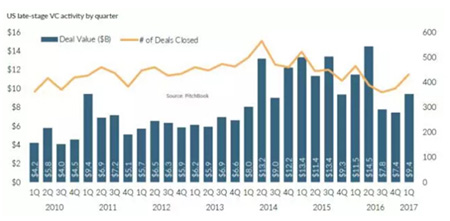 整體看來,交易活動回歸到平均水平是好的,2014年和2015年的投資市場太過火熱,導致許多非風險投資者都紛紛涌向該市場,將額外的資本都投入進來,導致估值飆升。退出緩慢、流動性不足使投資者更理性,也讓風險投資回到更可持續(xù)的后期投資。