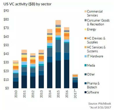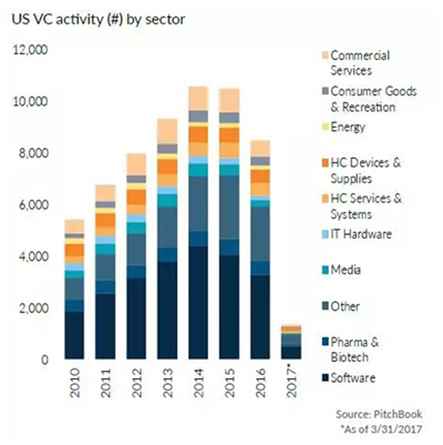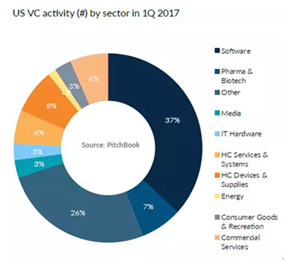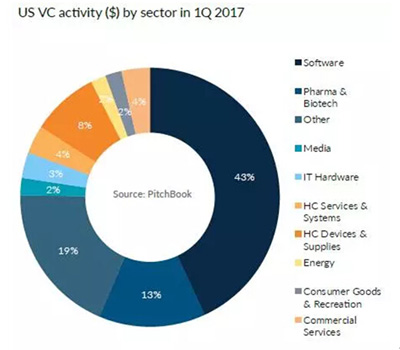 軟件行業(yè)仍然是占比最高的行業(yè),2017年第一季度達到了37%,但從趨勢上看占比呈下降趨勢。同樣占比下降的還有消費品和娛樂行業(yè),以及商業(yè)服務行業(yè)。制藥和生物科技的占比在持續(xù)增長。